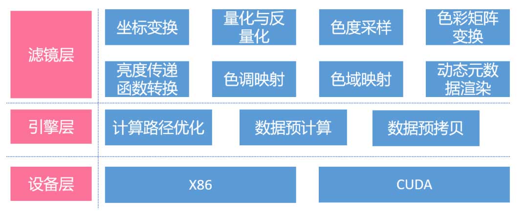 该图像转换引擎分为三层,包括滤镜层,引擎层,和设备层。其中滤镜层包含各种滤镜,用于处理不同的色彩参数。引擎层的主要目的是做一些预计算与计算路径优化,比如有一些矩阵乘法只需要计算一次,那么就可以预先计算出来,而不是在像素处理的时候再去做。有一些GPU需要用到的矩阵参数,则也可以进行预拷贝,防止出现CPU与GPU之间出现频繁拷贝的情况,计算路径优化,则是用来去除一些不必要的步骤,来减少计算量。最后,设备层主要包含每种滤镜在不同平台的实现,该引擎包含一个指令集优化的X86版本和一个CUDA版本。接下来我介绍一下该滤镜层的各种色彩转换能力,包括坐标变换、量化、色度采样,色调映射等等。