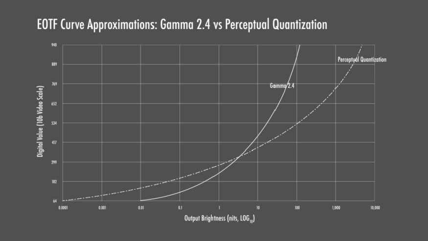 亮度传递函数是一种用于调整图像或视频信号亮度级别的函数,分为两种OETF(Opto-Electronic Transfer Function)和EOTF(Electro-Optical Transfer Function)。由于人眼对不同光线区域的敏感度不同,人眼对暗部细微亮度变化的敏锐程度较高,而对于高亮度的细微变化则较难察觉。为了以一种均匀的方式呈现信号,以符合人眼的感知,并且为了能够编码更多的信息,我们需要对信号进行OETF压缩。相反地,如果我们需要解压信号,则需要进行相反的处理,即EOTF。常见的EOTF曲线有Gamma2.4曲线和感知量化曲线(Perceptual Quantization,PQ),如下图。感知量化曲线是一种最接近人眼感知的量化方法,因此它也被广泛用作HDR视频的主要亮度传递函数。