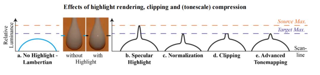 下图展示了不同的Tone mapping算法对图像的影响,b为原始HDR图片的色阶图,含有低亮度区域和高光区域,c为归一化(Normalization)方法的进行Tone mapping,虽然c的高光被压缩了,但是它的暗部细节也被等比例压缩,造成暗部细节丢失。d则是简单地将高光进行截断(Clipping),虽然暗部细节保留了,但是高光细节丢失了。e表征了一种更高级的方法,既可以保证暗部细节丢失很少,又可以保留一定的高光细节。