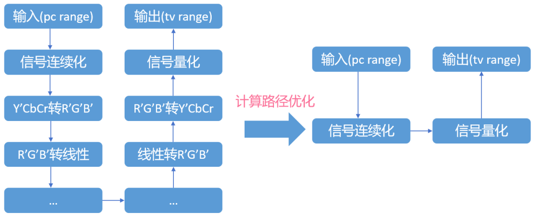 计算路径优化的主要目的是为了消除重复计算,以找到一个色彩空间到另外一个色彩空间的最优转换路径。举例来说,如果一个视频只需要进行range转换,那么我们无需整个转换路径走一遍,从而避免了额外的色彩转换和电光转换,如下图。