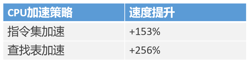 通过使用指令集优化和使用查找表优化策略,CPU端的性能提升达到如下