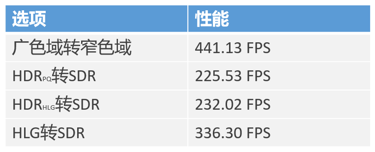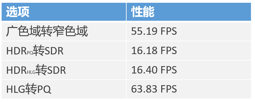 将CUDA端的代码进行一系列优化后,通过4K视频在RTX2060上的测试,我们的色彩空间引擎转换性能达到了225FPS+(未编码),对比于CPU端,处理速度得到了很大的提升,详细数据如下表