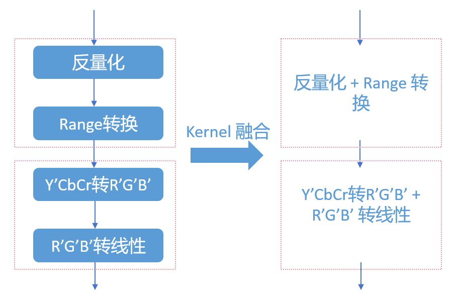 此外,由于CUDA在执行全局内存(Gobal memory)的I/O操作时非常耗时,因此我们应避免为每个细小的操作编写单独的核函数(Kernel)。相反,我们可以将一些操作合并到一个核函数中以减少I/O开销。例如,我们可以将range转换和量化处理合并为一个核函数,将色彩矩阵转换和亮度传递函数的转换也可以合并为一个核函数(如下图所示)。通过合并核函数,我们在一定程度上牺牲了一些通用性,但却能大大节省GPU的I/O开销。这样做是一个明智的选择,特别是在涉及I/O操作频繁的情况下。