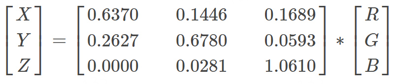 比如BT.2020色域的RGB转XYZ的公式如下: