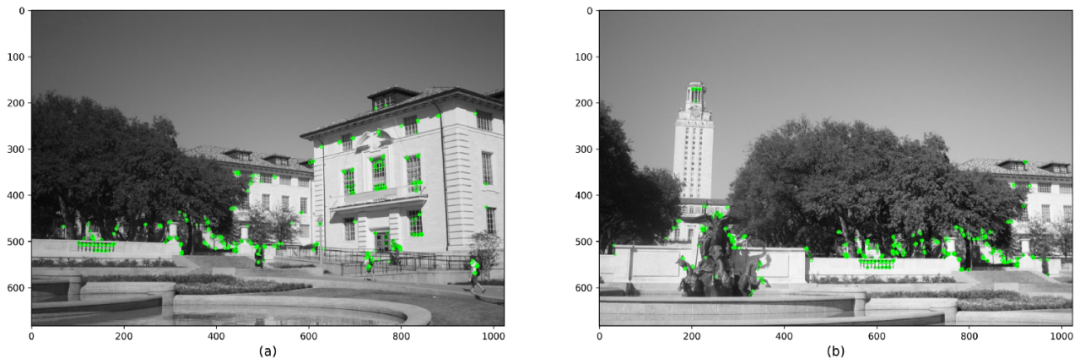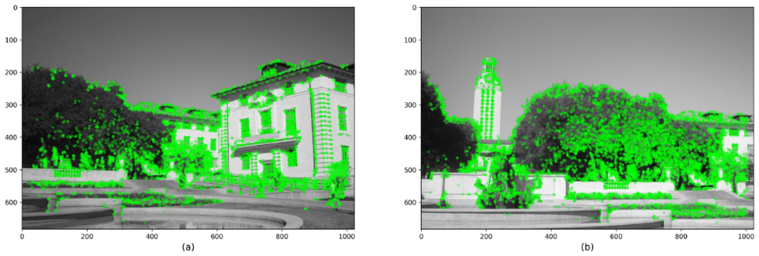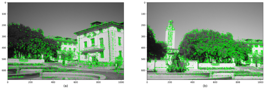 给定上述一对图像,我们希望将它们缝合以创建全景场景。重要的是要注意,两个图像都需要有一些公共区域。当然,我们上面给出的两张图像时比较理想的,有时候两个图像虽然具有公共区域,但是同样还可能存在缩放、旋转、来自不同相机等因素的影响。但是无论哪种情况,我们都需要检测图像中的特征点。