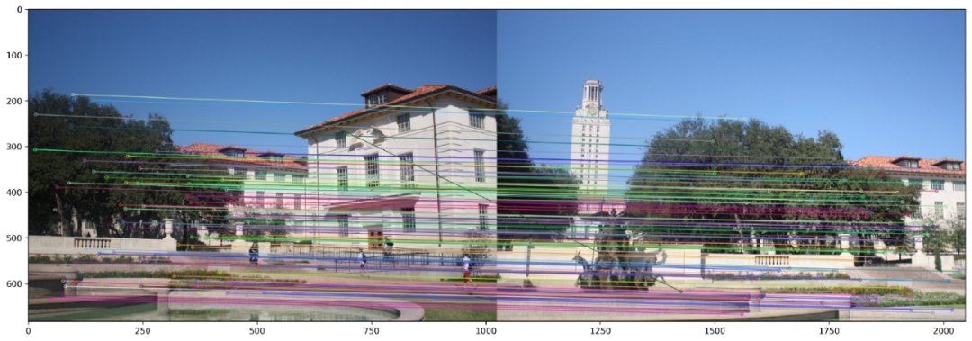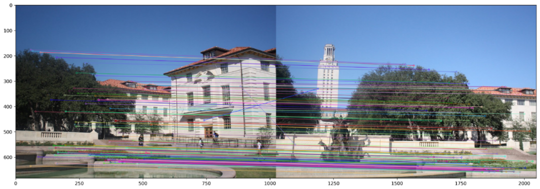 需要注意的是,即使做了多种筛选来保证匹配的正确性,也无法完全保证特征点完全正确匹配。尽管如此,Matcher算法仍将为我们提供两幅图像中最佳(更相似)的特征集。接下来,我们利用这些点来计算将两个图像的匹配点拼接在一起的变换矩阵。