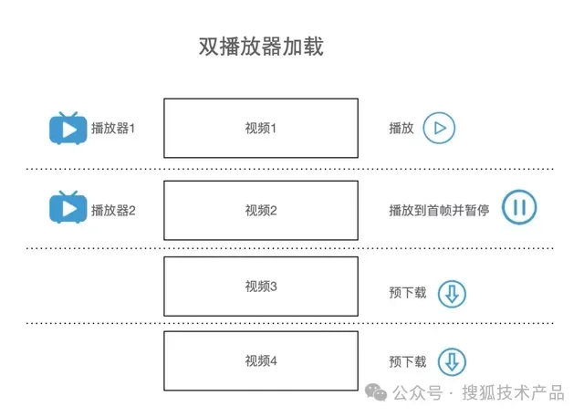 短视频沉浸式滑动播放场景,可以采取双播放器实例加载复用的策略,播放当前视频的同时,第二个播放器加载即将播放的视频,渲染首帧后暂停,列表其他视频进行预加载(预加载是纯下载的过程,无渲染逻辑)。