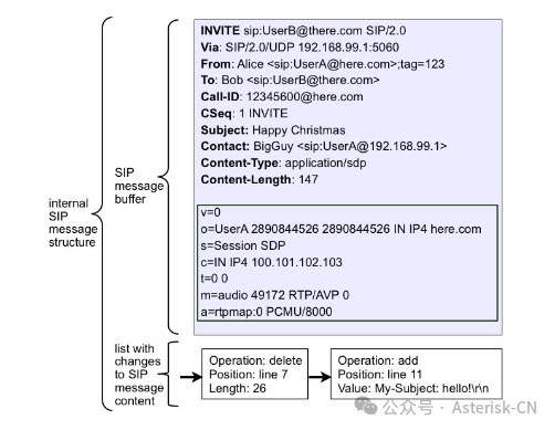 由于所有这些SIP属性都指向缓冲区内部,因此无需克隆这些值,这样就避免在解析期间进行大量的malloc和free内存操作。但从另外一个方面来看,如果不干预已解析的内容的情况下,则无法直接在缓冲区中更新这些值。解决办法是通过一个更新列表维护所有的删除或添加SIP消息中的值。例如,添加或删除头字段就属于此类操作。用户可以将其操作视为补丁列表,初始内容是相同的,不断增加补丁程序。下一个图表显示了删除头字段Subject并添加新标题My-Subject的内部操作流程。