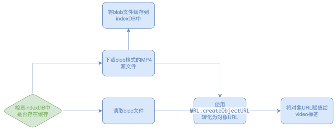 同时,为了资源的缓存,我们可以利用indexDB存储我们下载的blob文件,所以整个动效的加载过程如下:先去判断本地indexDB中是否已经存在对应的视频资源,如果存在,则直接读取对应的文件,如果不存在,则去下载视频资源,同时将视频资源缓存到本地,方便后续播放时重复使用,节约下载时间;然后再将下载后的资源转换为对象URL,赋值给video标签。