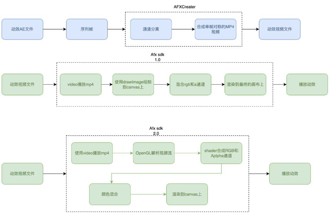 在afx sdk1.0中,使用drawImage获得mp4的视频帧信息,然后再使用cpu去计算混合后的效果,导致在动效播放时会大量占用主线程的算力,导致页面会十分卡顿,页面fps只有十几,同时cpu占用经常达到100%。后来为了优化性能,就改成使用OpenGL合成最终的rgba图片,这样页面fps就达到30~60fps。