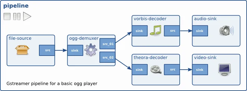 如果在谷歌上简单搜索一下 gstreamer,你可能会看到一些类似上图的图片。上图就是基于管道的 gstreamer 框架。在上述管道中,音频和视频被分割并输出到各自的硬件。