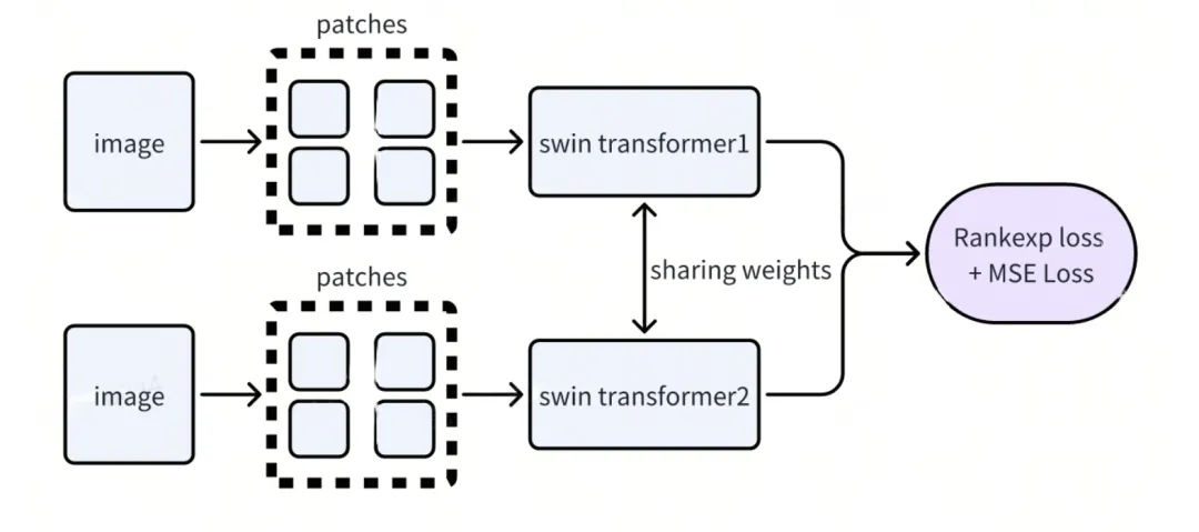 BDVQAGroup在比赛中使用了一种基于Swin transfoformer 和rank loss的无参考打分方法。该算法是一种深度学习算法,训练时在具有MOS的数据集上进行学习。抖音团队使用了孪生网络,一次输入两张图片来进行对比学习,使得模型可以针对图片的好坏程度进行排序。
