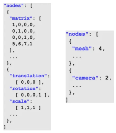 场景和节点分别用scenes、nodes字段描述,场景就是代表要渲染的一些东西的集合,场景里面包含一些节点,每个节点可以认为是一个物体(也可以是摄像机),节点也可以是空的,节点中可以继续挂子结点。