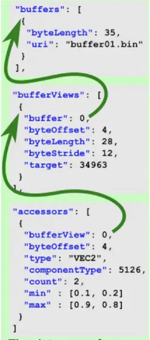 glTF中用buffers、bufferViews、accessors来描述数据: