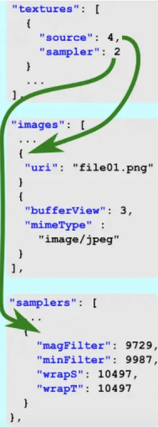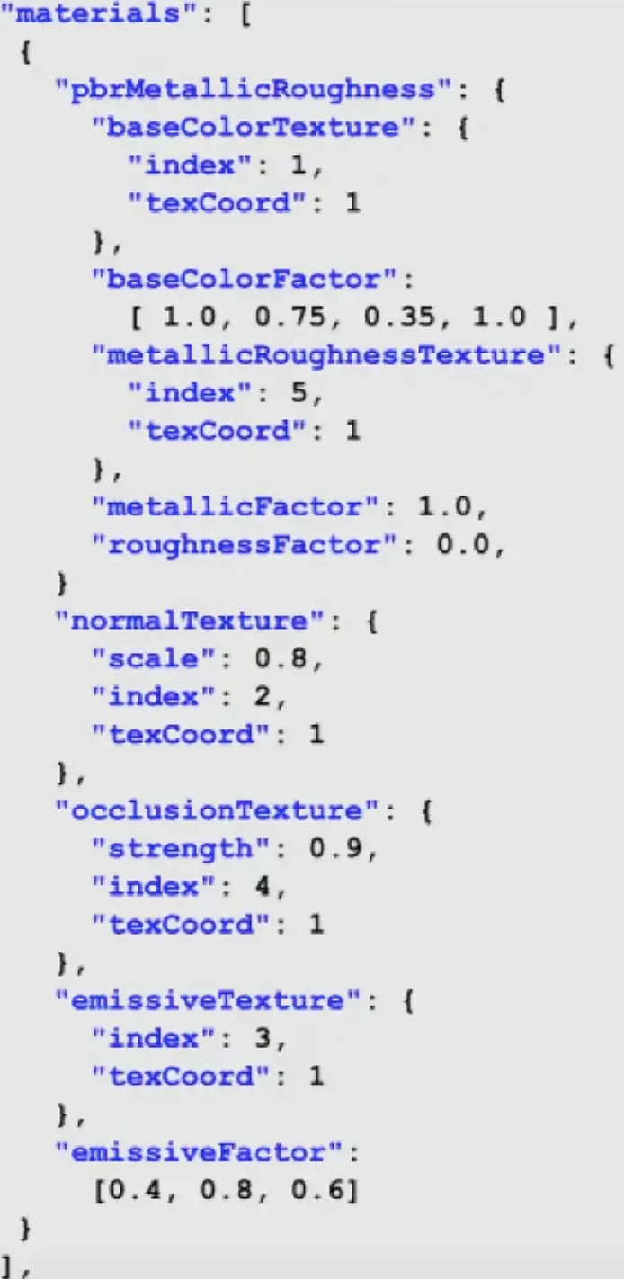 例如上图中的例子通过金属度-粗糙度模型来描述材质,其中有一些材质纹理图,比如基础纹理图、法向图、遮挡纹理图等,每个纹理图通过index来对应纹理图数组中的索引,纹理坐标也是类似的。