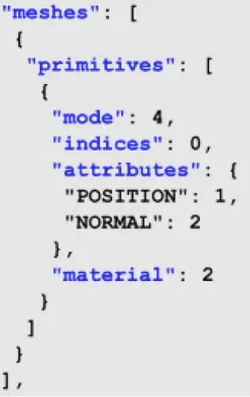meshs同样也是一个数组,每个mesh中由primitives描述图元,其中的mode是图元的种类,也就是点、线或者三角形,indices表示accessors中的索引,后面会讲到。