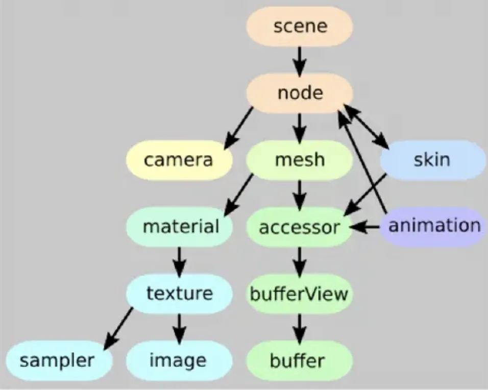 我们先来从一张图总体上看一下glTF文件的结构,每一种类型的字段,基本是都是用数组来组织,在每个字段中,又可以通过索引去引用其它字段。