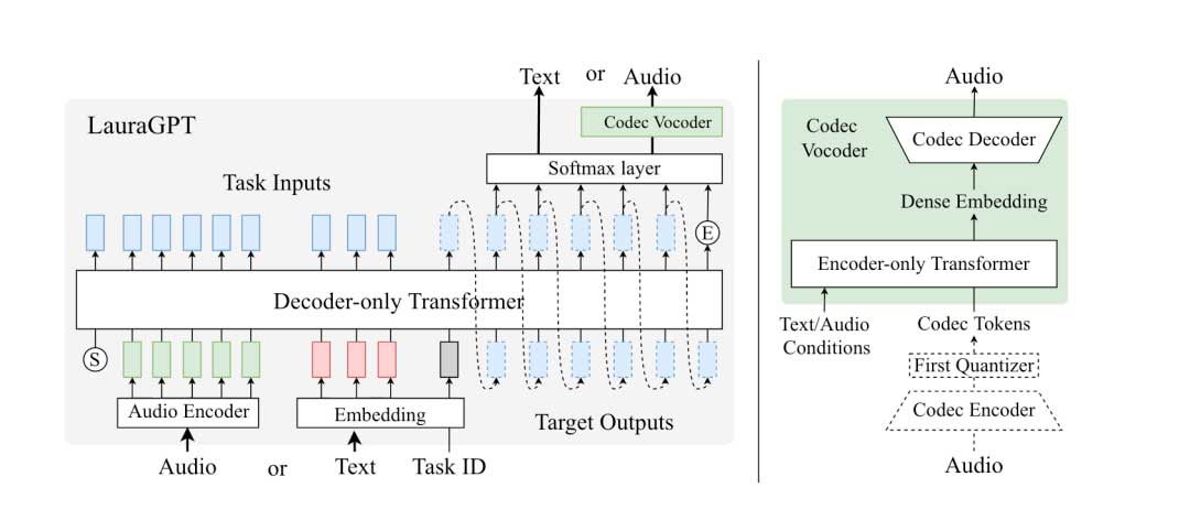 LauraGPT是阿里发表的一篇能够同时进行语音理解任务和语音生成任务的语音大模型,当时主要是对该论文进行了复现并进行了一些改进,然后完成了我们的第一版语音大模型,能够同时进行语音识别和语音生成,在语音识别和语音生成上的效果大致符合预期。LauraGpt的整体结构图如下: