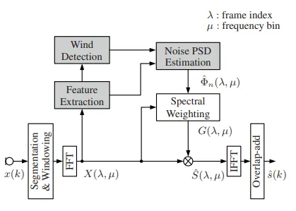 风噪抑制可以视为噪声消除算法的一种,常用的噪声抑制算法基于噪声平稳或准平稳假设之上,无法很好的抑制风噪声。因此,对于风噪的抑制与其他噪声抑制算法有所不同,一般风噪抑制算法流程如下所示。