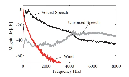 可以发现与正常的噪声抑制算法多了一个风噪检测模块,检测风噪声的发生是为了调整重建语音的范围,其目的是确定实际帧中受到干扰的频率范围。风噪的特征和语音相比在于低频区域,如下图所示。因此可以通过特定统计方式进行风噪检测。