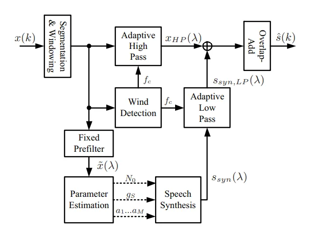 除了使用传统的降噪算法进行风噪抑制之外,还可以通过带宽扩展的方式进行风噪抑制,前面提到风噪主要集中在低频区域,因此可以将语音的带宽向低频扩展用于替换被高度干扰的低频部分,整体流程框架如下所示