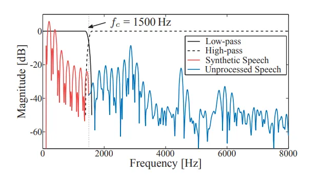 在估计出对应的语音合成器的系数之后就可以对带风噪声音进行降噪,原始信号经过上述系统处理后的结果如下图所示,由于生成信号会经过低通滤波因此不会影响到正常语音信号频谱范围。