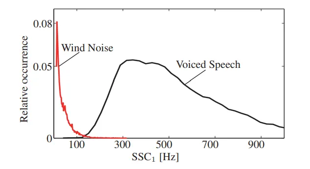 当然判别风噪是否存在还有其他方法比如计算子带的质心(sub-band centroids, SSC)或者依赖于风噪声频谱的幅度可以大致近似为随频率线性衰减这个假设使用负斜率拟合(negative slope fit, NSF)来进行风噪判别。对于风噪的检测,为了防止数据波动引起的误差一般都会在时间维度进行平滑处理。