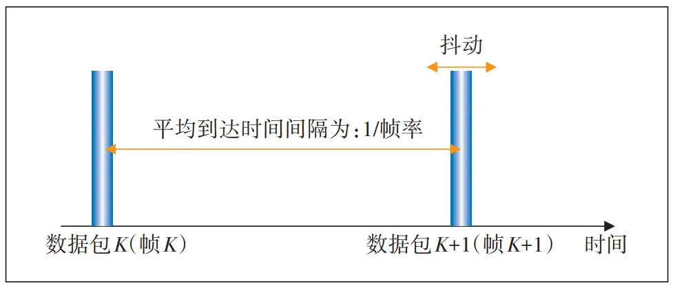 单个用户的单个下行视频流模型如图1所示,这里的一个数据包表示与单个视频帧对应的多个IP数据包。通过平均数据速率、帧率、抖动、数据包时延预算(Packet Delay Budget,PDB)构建XR的业务模型及传输要求。