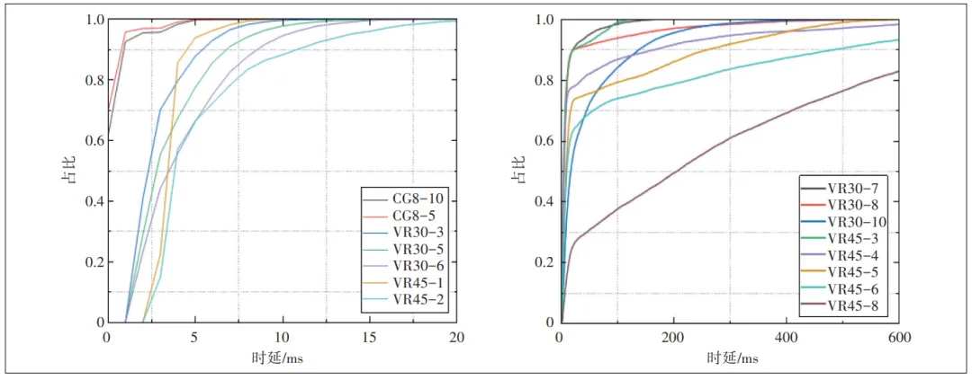图4所示为所有业务包传输时延的CDF分布,通过“应用场景—平均业务速率—用户数”来区分不同的变量配置。由图4可知,当应用场景为CG且数据传输速率为8 Mbit/s时,用户时延集中在5 ms以内;在同样的应用场景和数据速率下,随着用户数量的增长,用户时延逐渐变大。当AR/VR数据包传输速率为30 Mbit/s时,用户数低于6的情况下,超过90%数据包时延可以控制在10 ms以内。当AR/VR数据包传输速率为45 Mbit/s时,若用户数高于2,则将有超过10%的数据包时延达到几十甚至几百毫秒。