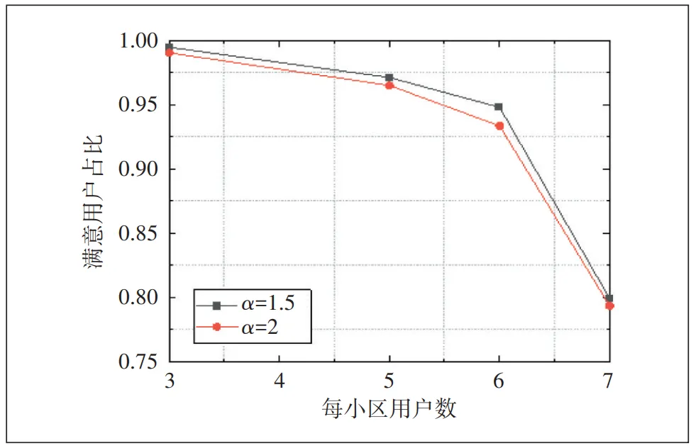 通过系统级仿真平台,在其他参数不变的条件下不断调整每小区服务的用户数,统计每次仿真中各个用户的数据包的传输情况,统计每个用户的包成功率,进而得到满意用户的比例。随着用户数逐渐增加,满意用户的占比将越来越低,从而得出该小区内XR业务的系统容量。仿真参数如表1所示。在该系统级仿真参数配置基础上,XR单流仿真假设PSR、PDB的值分别是99、10。双流业务模型下,I帧和P帧的[PER_I,PER_P,PDB_I,PDB_P]配置为[1%,1%,10 ms,10 ms],双流所有仿真的数据包传输速率均配置为30 Mbit/s,仿真考虑了α为1.5和2的情况。