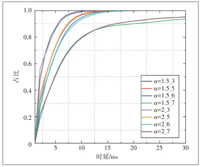 从图5可以看出,在相同的PER、PDB和数据速率配置下,α为1.5的情况下,小区容量为6.3,当α为2时,小区容量略有下降,仅有6.1个用户满足要求。可以看出当I帧占比变大时,支持的满意用户数略有降低。从图6可知,随着用户数量的增长,用户时延逐渐变大,且α对时延的影响较小。