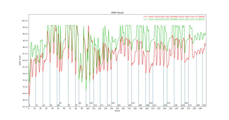 实测数据:以1080P、30fps的视频进行编码对比,Z264的VMAF实测得分92.9分,x264的VMAF实测得分87.6分。