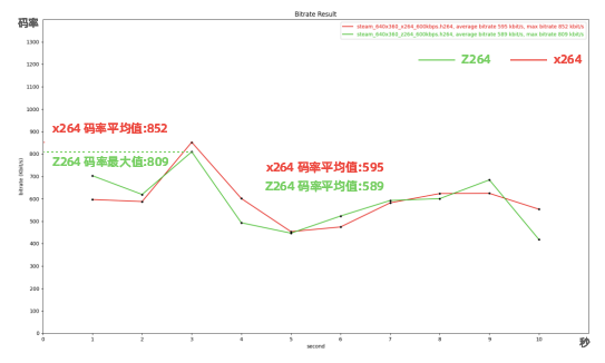 实测数据:针对分辨率为640×360的视频编码对比,Z264码率平均值为589,x264码率平均值为595。