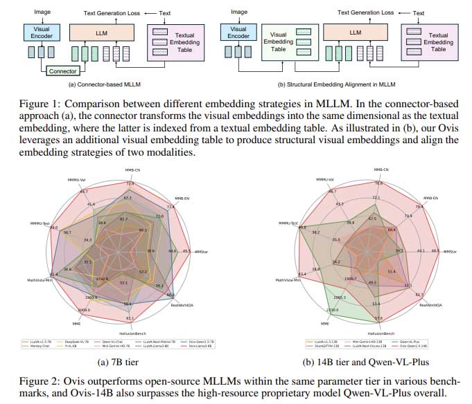 - 卓越的性能: Ovis 在各种基准测试中均优于类似规模的开源模型,比基于连接器的架构提高了 14.1%。