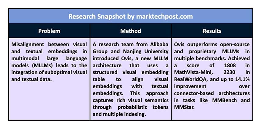 多模态学习面临的一个重大挑战在于文本和图像数据的编码和表示方式。文本数据通常使用从查找表派生的嵌入来定义,以确保格式结构化且一致。相比之下,视觉数据使用视觉转换器进行编码,从而产生非结构化的连续嵌入。这种表示上的差异使现有的多模态模型更容易无缝融合视觉和文本数据。因此,模型很难解释复杂的视觉-文本关系,从而限制了它们在需要跨多种数据模态进行一致理解的高级 AI 应用中的能力。