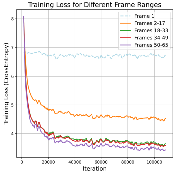 然而,大视频的生成相当棘手,未来还有许多挑战。首先,训练过程中存在损失不平衡的问题。当以下一个 token 预测为目标进行训练时,从文本提示预测早期帧的 token 比根据前几帧预测晚期帧的 token 更难,导致训练期间损失不均衡。随着视频长度的增加,来自简单 token 的累积损失掩盖了来自困难 token 的损失,主导了梯度方向。其次,该模型根据真实 token 预测下一个 token,但在推理过程中依赖于自己的预测。这种差异会造成误差累积,尤其是由于强帧间依赖性和许多视频 token,导致长视频推理中的视觉质量下降。