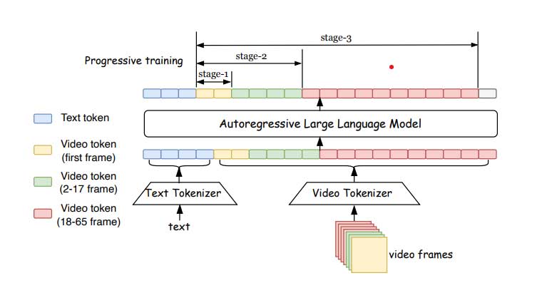 Loong 采用双组件系统设计,一个将视频压缩为标记的视频标记器、一个解码器和一个根据文本标记预测下一个视频标记的转换器。