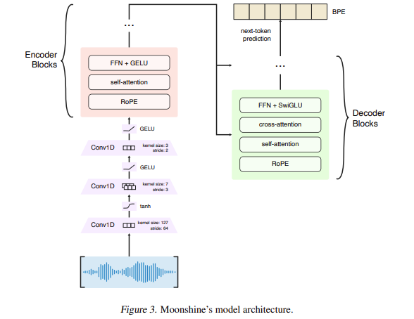 Moonshine 的核心架构基于编码器-解码器转换器模型,该模型消除了传统的手工设计特征,例如梅尔频谱图。相反,Moonshine 直接处理原始音频输入,使用三个卷积层将音频压缩 384 倍,而 Whisper 的压缩率为 320 倍。此外,Moonshine 还使用来自公开 ASR 数据集的超过 90,000 小时的综合数据集进行训练,另外还使用来自研究人员数据集的 100,000 小时,总计 200,000 小时的训练数据。这个庞大而多样化的数据集使 Moonshine 能够以更高的准确率处理各种音频输入,从不同的长度到不同的口音。