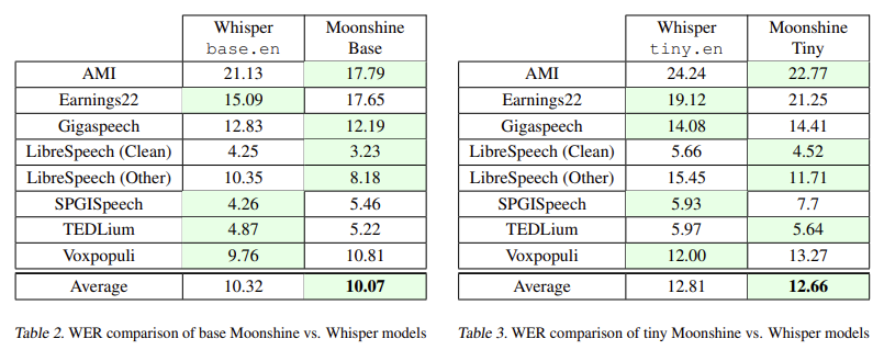 - 最小的 Moonshine 模型(Tiny)在各种数据集中保持了 12.81% 的平均 WER,与 Whisper Tiny 的 12.66% 相当。