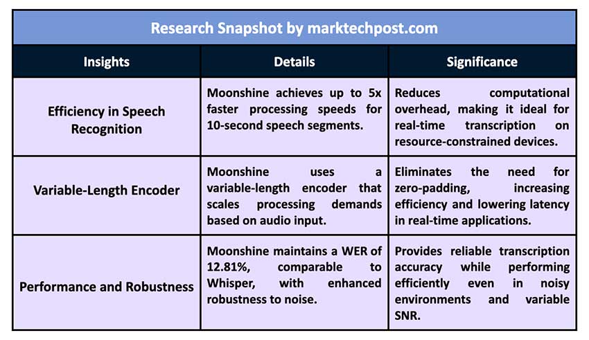 研究人员还强调了 Moonshine 在嘈杂环境中的表现。在针对信噪比 (SNR) 各异的音频(例如来自计算机风扇的背景噪音)进行评估时,Moonshine 在较低的 SNR 水平下仍保持了出色的转录准确度。Moonshine 对噪声的稳健性,加上其有效处理可变长度输入的能力,使它成为即使在不太理想的条件下也需要高性能的实时应用的理想解决方案。
