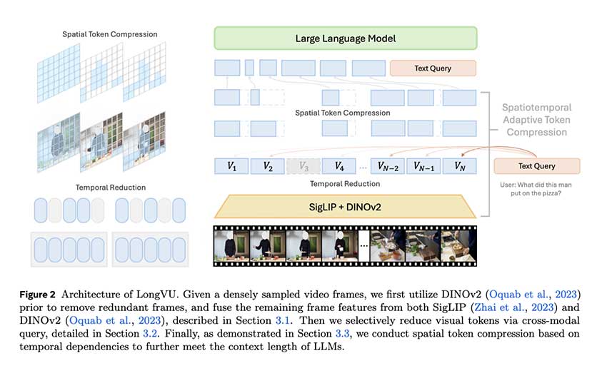 LongVU 的架构结合了 DINOv2 特征以进行帧提取、通过文本引导的跨模态查询选择性地减少帧特征以及基于时间依赖性的空间标记减少。首先,DINOv2 的特征相似性目标用于消除冗余帧,从而减少标记数量。然后,LongVU 应用跨模态查询来优先考虑与输入文本查询相关的帧。对于剩余的帧,空间池化机制进一步减少标记表示,同时保留最重要的视觉细节。