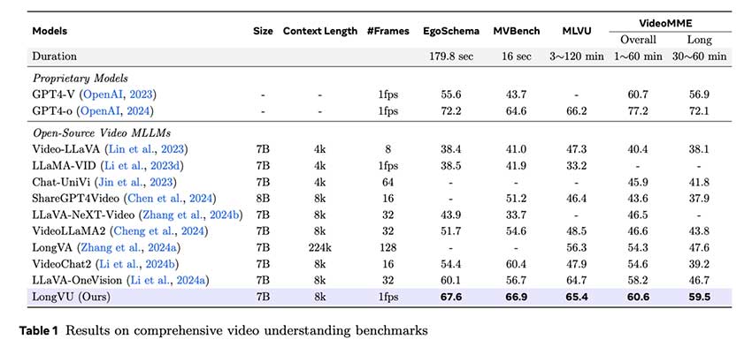 这种方法即使在处理长达一小时的视频时也能保持高性能。空间标记减少机制可确保在消除冗余数据的同时保留必要的空间信息。LongVU 处理每秒一帧 (1fps) 采样的视频输入,有效地将每帧的标记数量减少到平均两个,从而可以在 8k 上下文长度内容纳长达一小时的视频序列——这是 MLLM 的常见限制。该架构在标记减少与关键视觉内容的保留之间取得平衡,使其在长视频处理中非常高效。