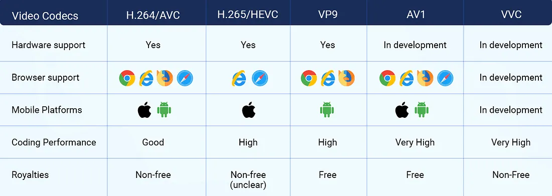 - 不同的设备和平台支持特定的编解码器。例如,iOS 支持 H.264 和 HEVC,而 Web 浏览器越来越多地支持 AV1 和 VP9。
