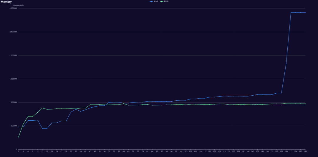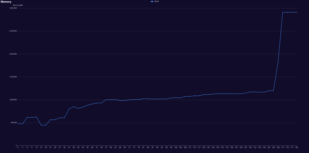 依旧还是之前的物料进行压力测试,可见内存整体增长情况态势与之前别无二致,所以基本可以确认,内存一直占用的问题是wasm底层Memory的设计导致的,所以malloc函数我们肯定是用不了了。