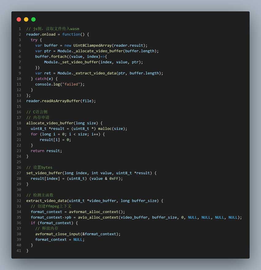 大视频无法检测:通过分析”IO核心代码”一图可以看到,视频文件是转成ArrayBuffer后通过forEach把一个个的字节塞入了提前申请好的内存中来实现数据传递的,这种方案存在两个问题: