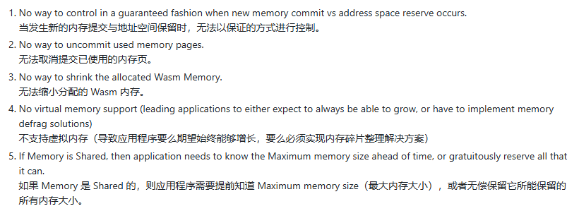 通过流程图可见内存已经被正确的申请和释放了,但是实际表现确是申请的内存一直在被占用,所以可能不是代码逻辑问题,在翻阅了wasm官方设计文档时发现一个issue,其中提到了wasm内存设计方案存在几个问题(该issue还处于open状态):