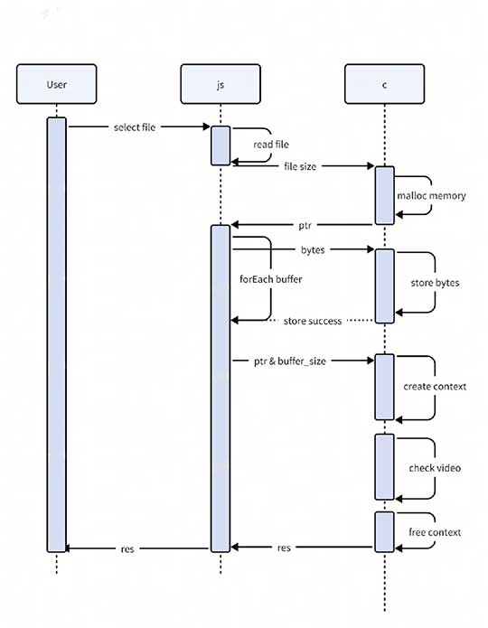 目前得物音视频团队在上传前的预检测这种场景下已有了一套较为完善的方案,那就是使用C+ffmpeg编写好检测代码后再通过Emscripten工具将其打包成WebAssembly的二进制文件使代码运行在web端。