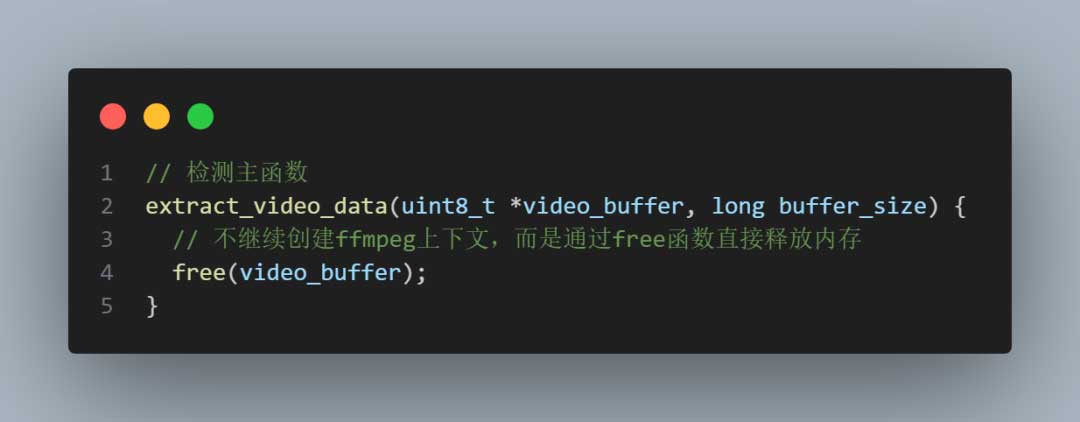 所以正是由于第2、3点导致了wasm占用的内存只能被扩大,而无法通过释放被缩小,一旦过多的使用malloc内存占用达到wasm的最大内存限制后,申请必将失败,后续的链路也就无法继续了。那么排除其他因素,通过代码验证一下吧,我们只需要将extract_video_data函数修改一下,直接释放掉接收的内存指针指向的内存块: