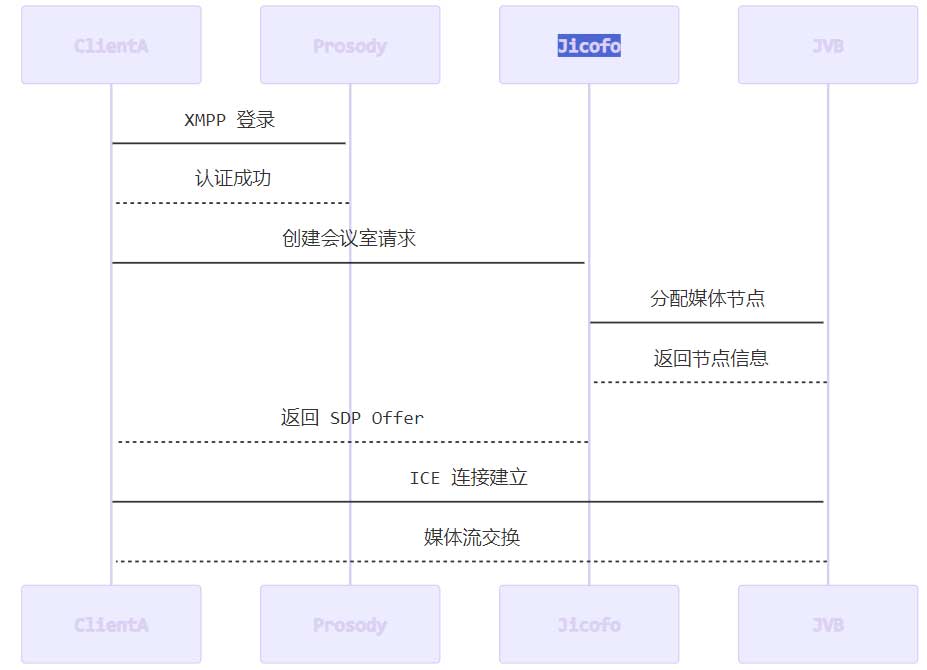 Jitsi Meet 的工作流程涉及多个模块之间的协同工作。下面将详细介绍典型的会议建立流程和数据流转机制。