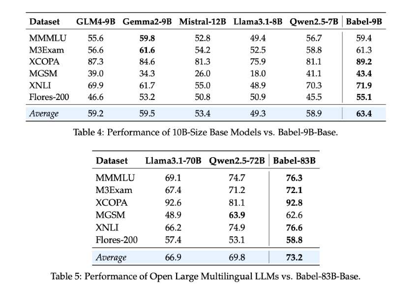 - Babel-9B 的表现优于类似规模的模型,平均得分为 63.4,而 Babel-83B 则以 73.2 创下了新基准。这些模型在推理、翻译和多语言理解任务中表现出了最佳性能。